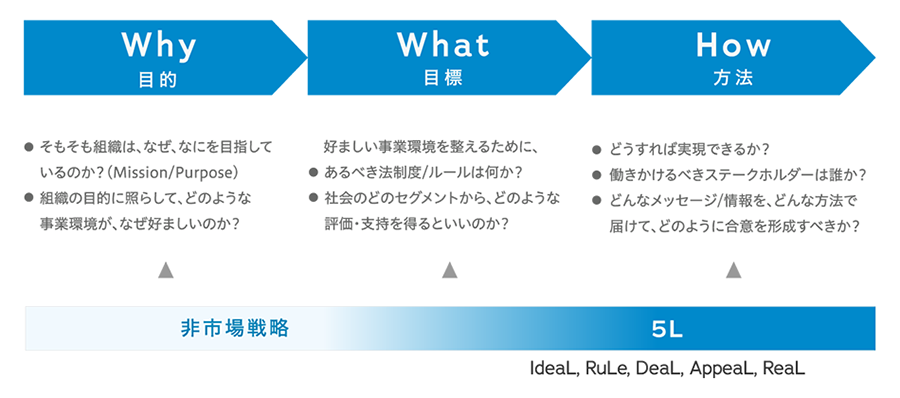 自らのミッション実現のために、どのような環境(法制度・ルールや社会の認識・評価)を整えるのが望ましいのかを構想し、その実現のためにステークホルダーの支持・共感を獲得する方策を練る、こうした「非市場戦略」が重要になっています。